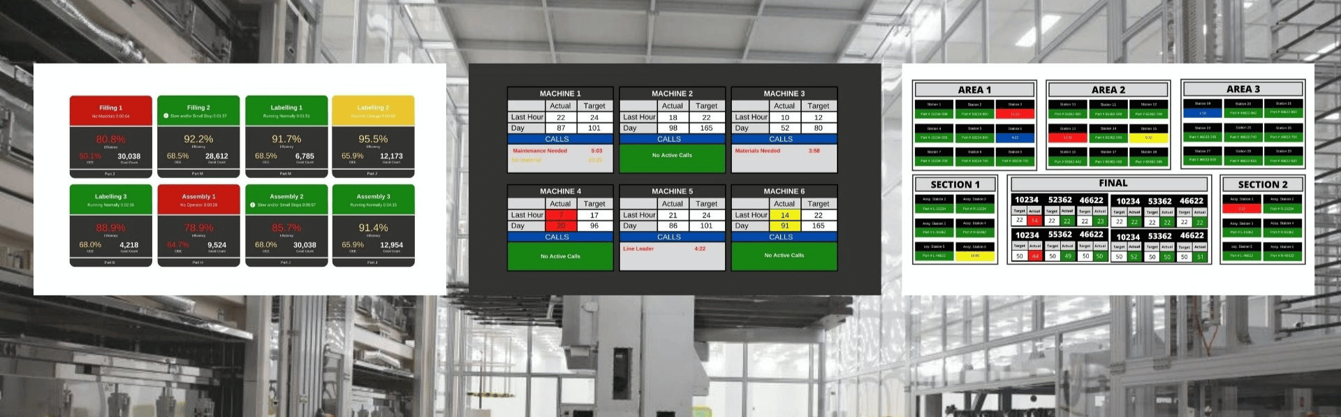 Visual OEE: It is the display of important criteria such as OEE obtained from the system in the production environment, production quantities, work order fulfillment percentages, downtime, and performance values on a digital board within the company.