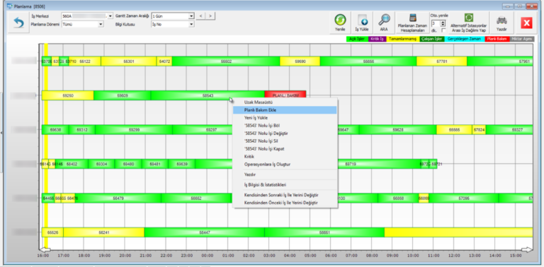Gantt grafiği belirli bir zaman aralığındaki planlanmış işlerin görsel temsilini sunmaktadır. Aşağıdaki program görselinden de görülebileceği üzere sadece bir görsel değil, aynı zamanda iş emirlerini makine dağılımını gözlemleyerek sürükleme yöntemi ile dağıtma yapabileceğiniz, belirli nedenlerle araya giren işler sebebiyle iş bölme işlemi, belirli saat aralığını planlı bakım nedeniyle kapama işlemi gibi iş emirlerinin yönetimini gerçekleştirebileceğiniz ekrandır.